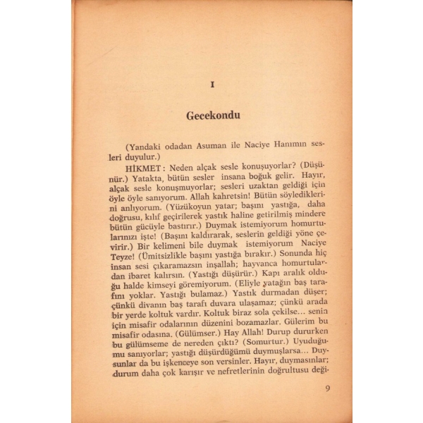 Ağlasa da gizliyor gözlerinin yaşını Bir kere eğemediğim bu kadının başını Kaç kere sürükledi gururumu ölüme Fırtınalar yaratan benim coşkun gönlüme Cevapları öyle heyecansız ki onun, Kaç kere iman ettim hiçliğine ruhunun Kaç kere hissettim ki, yine bu gece gibi Güzelliğin önünde dolup çarpmalı kalbi Ne mehtabın aksine yelken açan bir sandal Ne de ayaklarında kırılan ince bir dal Onun taştan kalbini sevdaya koşturmuyor Bir çiçeğin önünde bir dakika durmuyor Dönüyoruz yine biz uzun bir gezintiden Gönlümün elemini döküyorken ona ben O bana kendisini gülerek naklediyor Bilseniz mavi boncuk nasıl yaraştı diyor. Ya bu kadın delidir yahut ben çıldırmışım Ben ki birçok kereler kırılmışım, kırmışım Ömrümde duymamıştım böyle derin bir acı; Birden onun yüzüne haykırmak ihtiyacı Alev alev tutuştu yangın gibi Bir dakika kendimin olamadım sahibi Hiç olmazsa hıncımı böyle alırım dedim, Yola mağrur uzanan gölgesini çiğnedim!