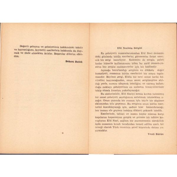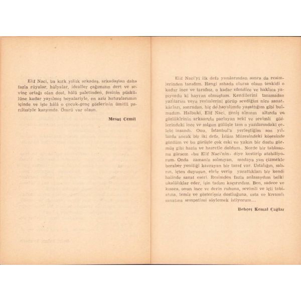 İthaf, "Yüksel Hanımefendi'ye hürmetlerimle, Elif, 1954" şeklindedir. Kitabın içerisinde 34 yazar, düşünür ve çizerin ressam Elif Naci hakkındaki yazıları mevcuttur. Elif Naci, ilköğrenimini, çocukluğunun geçtiği Edirne’de tamamladı. Sekiz yaşındayken geldiği İstanbul’da Ayasofya Rüştiyesi (Ortaokulu) ile Vefa Sultanisini (Lisesini) bitirdi. Sanayi-i Nefise Mekteb-i Âlisi’nin Resim Bölümüne girerek İbrahim Çallı’nın öğrencisi oldu. (1913). Birkaç ay sonra Birinci Dünya Savaşı çıktı ve askere alındığı için dört yıl aradan sonra eğitimine devam edebildi. Öğrenciliği sırasında geçinebilmek için arşiv memuru olarak gazeteciliğe başladı. Çeşitli sanat yazıları yazarak polemist oldu. İleri, İkdam, İfham, Milliyet, Tan, Son Telgraf ve Cumhuriyet gazetelerinde çalıştı. Akademiden mezun oluşunun ardından Türk ve İslâm Eserleri Müzesine önce müdür yardımcısı, sonra müdür oldu. Ressam olarak ilk kişisel sergisini Alay Köşkü’nde açtı (1930). Sanat hayatına asıl girişi 1933’te açılan, kurucuları arasında bulunduğu, D Grubunun ilk sergisiyle oldu. Bu grubun içinde yurtdışında da çeşitli karma sergilere katıldı. İkinci kişisel sergisini Eminönü Halkevi’nde (1947), üçüncüsünü ise retrospektif olarak Galatasaray Lisesi girişinde açtı (1951). Aynı dönemde Paul Klee, George Braque gibi çağdaş ressamlardan ve Hafız Osman, Mehmet Esat gibi hat sanatçılarından etkilendiği söylenebilir. 1940'lardan sonra batı sanatının etkisinden sıyrılıp doğuya yönelerek hat sanatı soyutlamalarıyla ilgilendi. 1937’de Türk ve İslâm Eserleri Müzesi’nde, iki yıl sonra Topkapı Sarayı Müzesi’nde müdür yardımcılığı yaptı. 13 Temmuz 1963’te emekli oldu. Müzecilik hayatının bir bölümünde, basında da görev yaptı.
