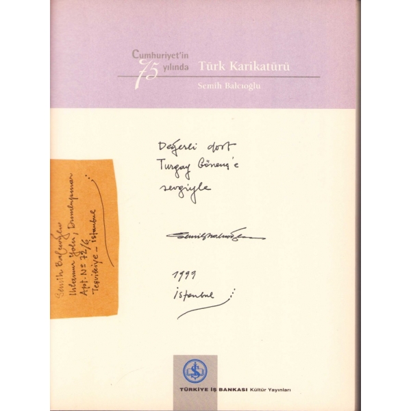 İthaf, "Değerli dost Turgay Gönenç'e sevgiyle, Semih Balcıoğlu, 1999 İstanbul" şeklindedir. 1928 İstanbul'da doğdu. Işık Lisesi'ni ve Devlet Güzel Sanatlar Akademisi'nin Grafik Bölümü'nü bitirdi. İlk karikatürünü 1943 yılında Akbaba Dergisi'ndeki Genç Fırçalar bölümünde yayınladı, o günden sonra karikatürü hiç bırakmadı. Amcabey, Akşam, Dünya, Hürriyet ve Tercüman, Politika, Yeni Yüzyıl gazetelerinde çalıştı. Çarşaf ve Çivi dergilerini yönetti. Meslek hayatı boyunca 49 ödül kazandı ve Gabrova Mizah Evi'nin yaptığı oylama sonucu dünyanın en iyi 106 çizerinden birisi oldu. Türkiye’de ilk üç boyutlu karikatürü gerçekleştirdi. 67 kişisel sergi açtı. 1969'da iki arkadaşıyla beraber Karikatürcüler Derneği'ni kurdu ve 7 dönem derneğin başkanlığını yaptıktan sonra 1996'da derneğin onursal başkanı seçildi. 1973-1979 arasında Türkiye Gazeteciler Sendikası'nın başkanlığında bulundu. Karikatürlerini 60 kişisel sergide sergiledi, 19 karikatür kitabı yayımlandı. 27 Ekim 2006 günü geçirdiği kalp krizi sonucu hayatını kaybetti.