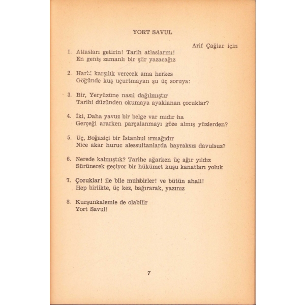 İthaf, "Sevgili Turgay'a iyi şairime, İlhan Berk" şeklindedir. İlhan Berk, Necatigil’in deyimiyle “şiirimizin uç beyi”, 1918’de Manisa’da doğdu. İlk şiirleri Manisa Halkevi dergisi, Uyanış, Varlık, Çığır gibi dergilerde çıktı. 1944 yılında Ankara Gazi Eğitim Enstitüsü’nün Fransızca Bölümü’nü bitirdi. Destansı yönünün ağır bastığı, adeta bir Türk Walt Whitman’ı olarak adlandırıldığı dönemde İstanbul (1947), Günaydın Yeryüzü (1952), Türkiye Şarkısı (1953) ve Köroğlu’nu (1955) yayımladı.