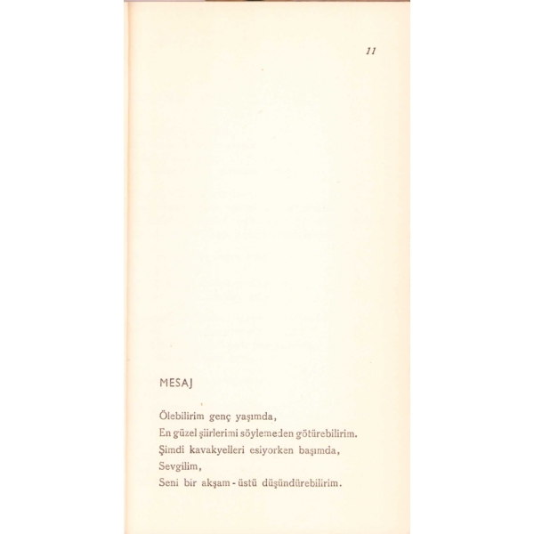 İthaf, "Kovan Mecmuası'na Ali Tomrukçuoğlu 20-1-1944" şeklindedir. Kitaptaki şairler arasında İlhan Berk, Salah Birsel, Asaf Halet Çelebi, Bedri Rahmi Eyüboğlu, Orhan Veli Kanık da bulunmaktadır.