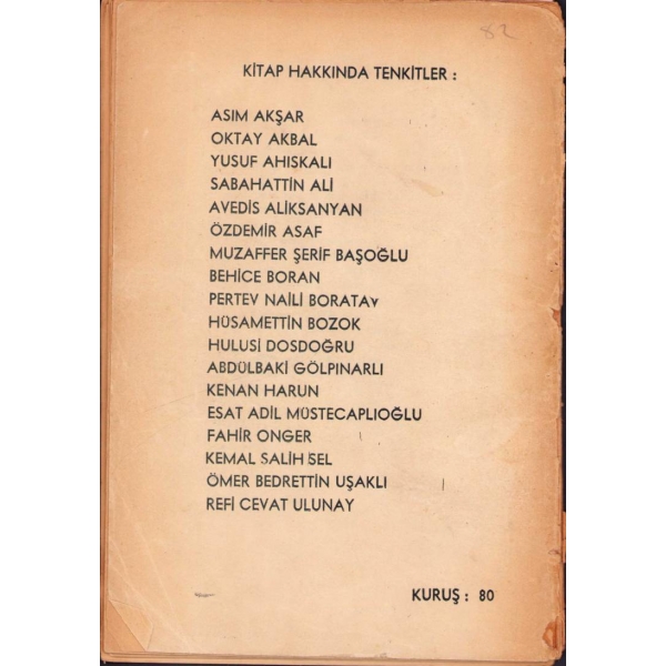 İthaf, "Sevgili Turgay'a özlemle, Fethi Naci, 71" şeklindedir. Fethi Naci 1927 senesinde Giresun'da doğdu. Erzurum Lisesi'ni, İstanbul Üniversitesi İktisat Fakültesi'ni bitirdi. 1950'lerde başlayan edebiyat eleştirmenliği uğraşısı yıllar içinde roman alanında yoğunlaştı. Türk romanı üstüne çalışmalarıyla bu alanın düşünceleri en çok merak edilen eleştirmeni oldu. Yayınevimizce yayımlanan Dönüp Baktığımda adlı anılar kitabında ise, yaşamını, içine dünyayı, ülkesini ve insanlarını sığdırabildiği etkileyici bir anlatımla çizdi.