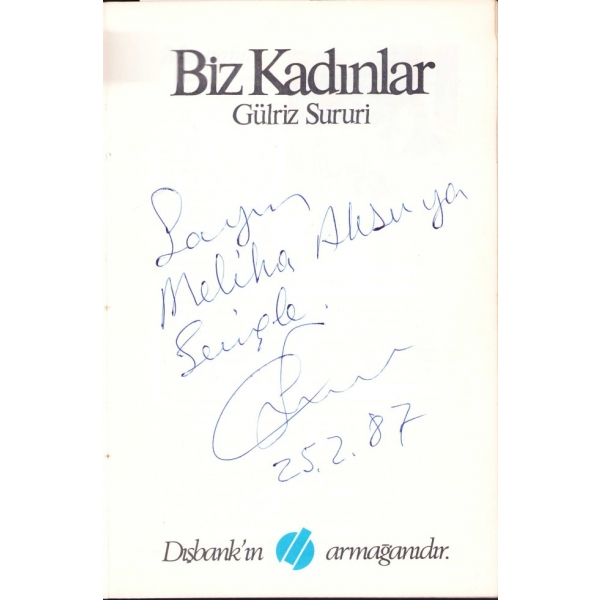 İthaf "Meliha Aksu'ya sevgiyle 25.2.87" şeklindedir. Tiyatrocu ve yazar Gülrüz Sururi 23 Ocak 1929 tarihinde İstanbul‘da doğdu. Babası ilk operet kurucularından Lûtfullah Sururi, annesi ilk Türk primadonnası Suzan Lûtfullah Sururi’dir. 1942'de ilk kez Muhsin Ertuğrul‘un isteğiyle İstanbul Şehir Tiyatrosu Çocuk Bölümü’nde sahneye çıkmaya başladı. İstanbul Belediye Konservatuvarı Tiyatro ve Şan bölümlerinde okudu. 1962'de Eşi Engin Cezar ile birlikte Gülriz Sururi-Engin Cezzar Tiyatrosu’nu kurdu. 1998 yılında Kültür Bakanlığı tarafından Devlet Sanatçısı unvanı layık görülmüştür. 31 Aralık 2018'de İstanbul'da vefat etti.