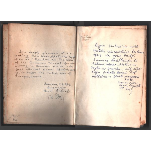 Türkçe ithaf, "Büyük Atatürk´ün Milli Kurtuluş mücadelesine başlamak üzere ilk ayak bastığı Samsuna teşrifinizin bir hatırası olarak "Atatürk´ün Söylev ve Demeçleri" adlı kitabı sayın [?] başkanı Prof. Hallstein´e zevkle sunuyorum. 9.9.963 Samsun Valisi Hamdi Ömeroğlu" şeklindedir.