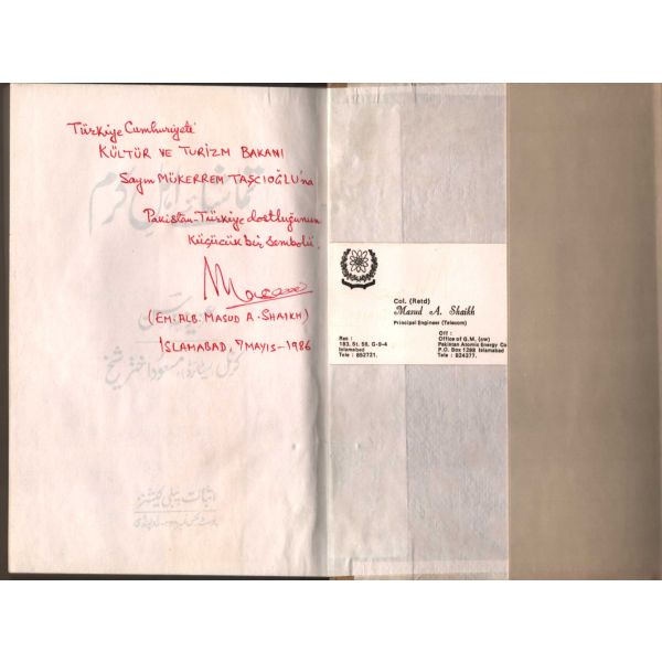 İthaf, "Türkiye Cumhuriyeti KÜLTÜR VE TURİZM BAKANI Sayın MÜKERREM TAŞÇIOĞLU´na Pakistan-Türkiye dostluğunun küçücük bir sembolü. EM. ALB. MASUD A. SHAIKH - ISLAMABAD, 7 MAYIS 1986" şeklindedir.