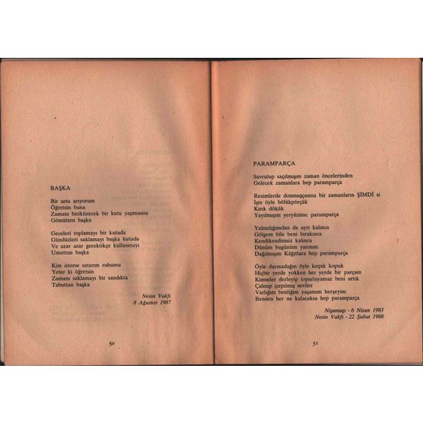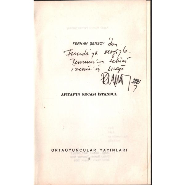 İthaf, "Ferhan Şensoy´dan Funda´ya sevgiyle. Temmuz´un sekizi İzmir´in sıcağı. 1991" şeklindedir.