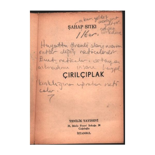 İthaf, "Değerli genç dostum Mükerrem Taşçıoğluna 15.9.1954 Nasuhi Baydar" şeklindedir.