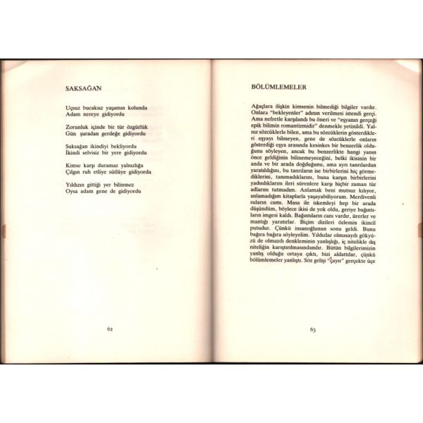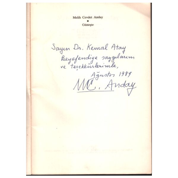İthaf, "Sayın Dr. Kemal Atay Beyefendiye saygılarım ve teşekkürlerimle. Ağustos 1989 M.C. Anday" şeklindedir.