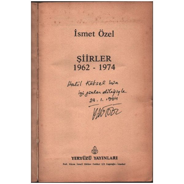 İthaf, "Halil Köksel için iyi günler dileğiyle. 28.1.1984 İsmet Özel" şeklindedir.