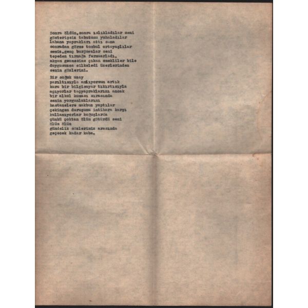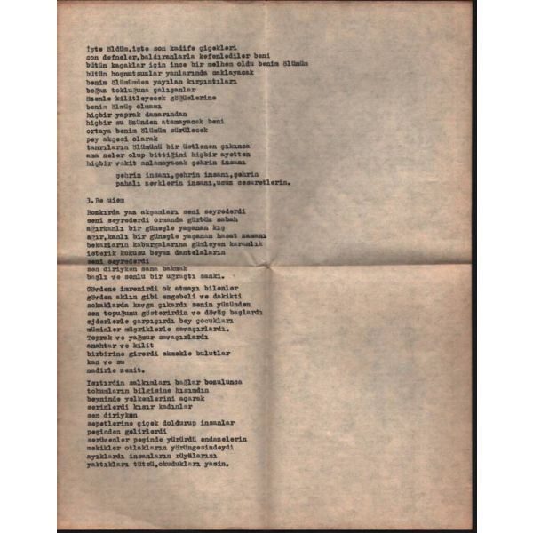 "Ne sevdanız sizin sevda, dostlarım! / Ne davanız sizin dava, dostlarım! / Bana darılmayın ama, dostlarım, / Kalp hali var erimemiş gümüşte."