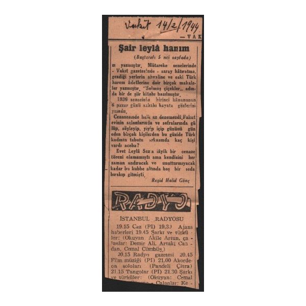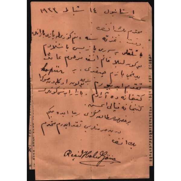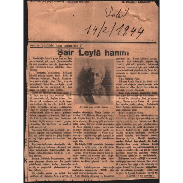 "Muhterem Beyefendi, Vakit gazetesine 'Benim Gözümle Yazı Yazanlar' başlıklı bir seri yazısı başladım. Bugün, Leylâ Hanımefendi merhuma ait yedinci yazım çıktı. Bir kupür takdim ediyorum. Sizi bugün öğleden sonra kütüphanede aradım. Pazartesi günleri kütüphane kapalı imiş. Bu hususta mütalaanızı rica edeceğim. Derin hürmetlerimi takdim ederim muhterem beyefendi. Reşid Halid Gönç. 14 Şubat 1933 - İstanbul."
