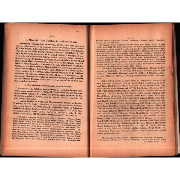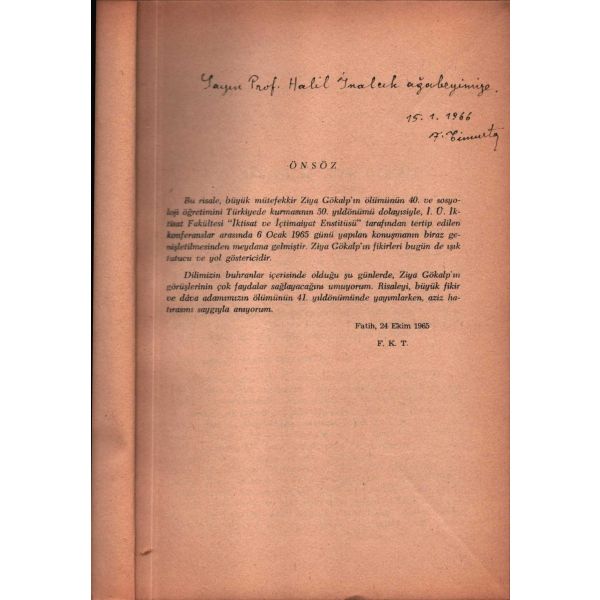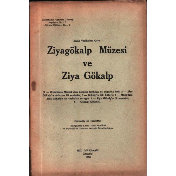 İthaf, "Ârifiye İlköğretmen Okulu Kitaplığına 13.XII.1957 Kırzıoğlu" şeklindedir. Kitap içerisinde katlanır levha halinde "Ziya gökalp Âilesi Kütüğü" ve "Ziyagökalp Müzesi Plânı" başlıklı ekler yer almaktadır.