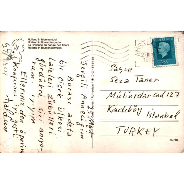 "25 Mart - Sevgili Anneciğim, Burası adeta bir çiçek ülkesi. Laleleri zübülleri gördükçe sizi anıyorum. İyiyim. Ellerinizden öperim. Konferans iyi geçti. Haldun"