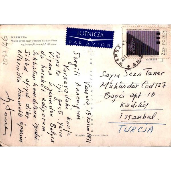 "Varşova 19 Kasım 1971 - Sevgili Anneciğim, Varşovadaki konferansta iyi geçti. Yarın Viyana üzerinden Belgrada hareket ediyorum. Sıhhatim hamdolsun iyidir. Sıhhat afiyet diler, ellerinden hürmetle öperim. H. Taner"