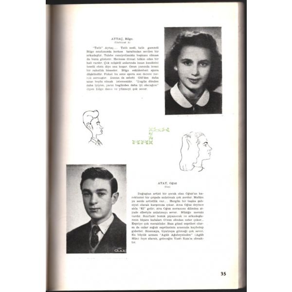 "ATAY, Oğuz (Fen): Doğuştan artist bir çocuk olan Oğuz´un karakterini bir çırpıda anlatmak çok zordur. Malûm ya serde artistlik var... Hergün bir başka şahsiyet olarak karşımıza çıkar. Ama Oğuz deyince akla ´El´ gelir; zira Oğuz meramını dilinden ziyade elleriyle anlatmayı sever. Müziğe merakı vardır. Sınıftaki bozuk piyanocuk ve arkadaşlarının biçare kafaları O´nun elinden neler çeker... Espriye çok meraklıdır. Bazı güzel esprileri olursa da onlar soğuk esprilerinin arasından kaybolup giderler. Sinemaya, tiyatroya gitmeği çok sever. En büyük arzusu ´Agâh Ağabeysinden´ (Agâh Hün) feyz alarak, geleceğin Vasfi Rıza´sı olmaktır."