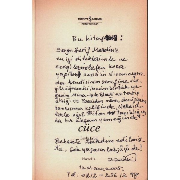 Şerif Mardin´e hitaben kaleme alınan ve imza sahibi tespit edilemese de büyük bir ihtimalle Leylâ Erbil´in kaleminden çıkma ithaf şu şekildedir: "Bu kitap: Sayın Şerif Mardin´e en iyi dileklerimle ve sevgilerimle (en kısa yapıtım) 2005´in Nisan ayında kendisinin şerefine sevgili öğrencisi, benim biricik yeğenim Mina - Işık ?´un tertip ettiği ve Posedion nâm, denizlerin tanrısının eşliğinde, Nereidlerle oğul Triton tanıklığında bir akşam yemeğinde Bebekte takdim edilmiştir. Çok yaşasınlar; üçü de! -İmza- 12 Nisan 2005." şeklindedir.
