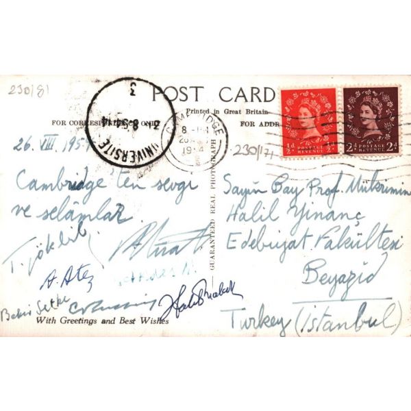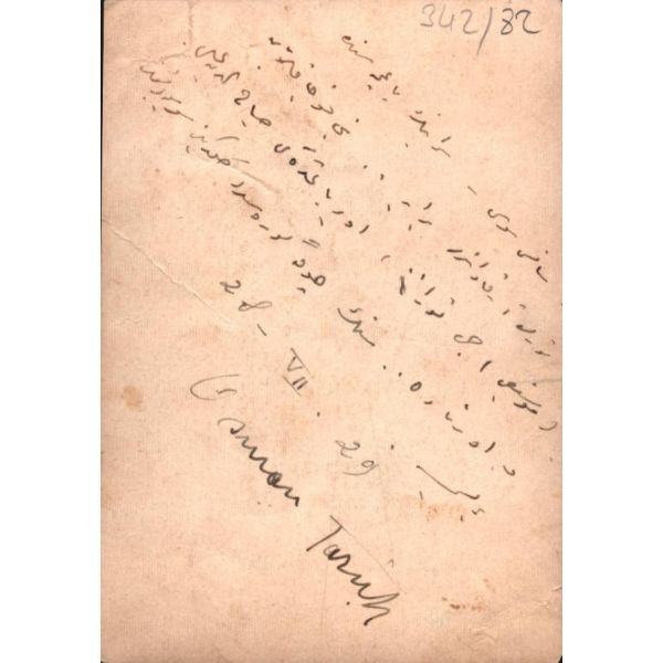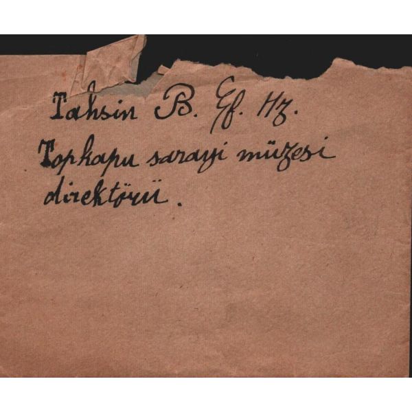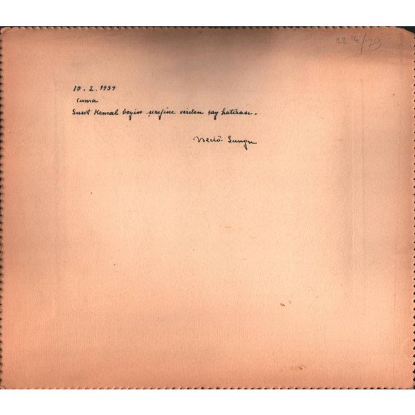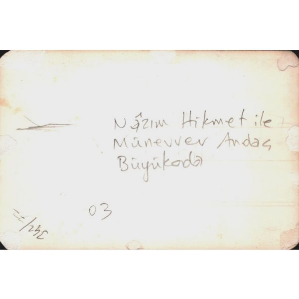Fotoğrafın arkasında, "Sanssouci Sarayı’nın bağçesinde Türk arkadaşlarla beraber. Beni kucaklayan [...] Öbür yanımdaki Sabahaddin Ali’dir ve ortada senin çok göresini geldiğini ..., 28.VII.29" yazmaktadır.