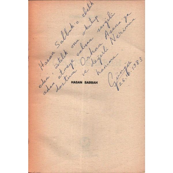 İthaf, "Hasan Sabbah´a ebelik eden, üstelik onu okutup adam etmeye çalışan sevgili dostum Orhan Asena´ya ve değerli Neriman hanıma. Güngör 26.10.1983" şeklindedir.