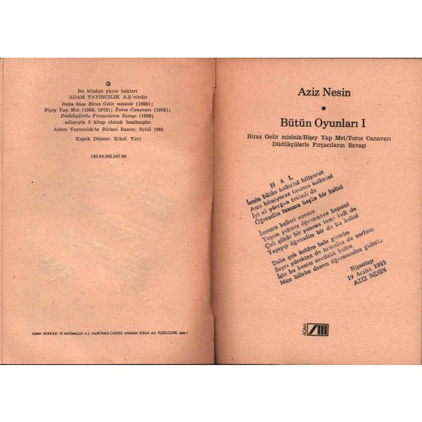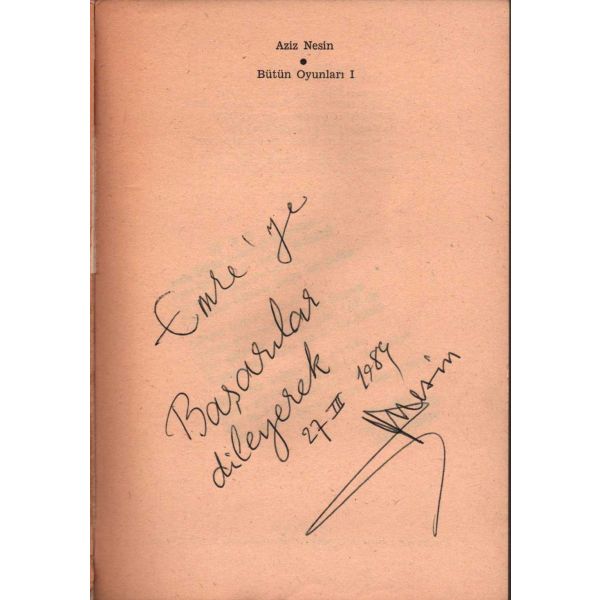 İthaf, "Emre Başarılar dilereyerek. 27 III 1984 A. Nesin" şeklinde olup, kitabın ilk sayfasına kaşeyle Aziz Nesin´in "Hal" başlıklı ve 19 Aralık 1983 tarihli şiiri vurulmuştur.