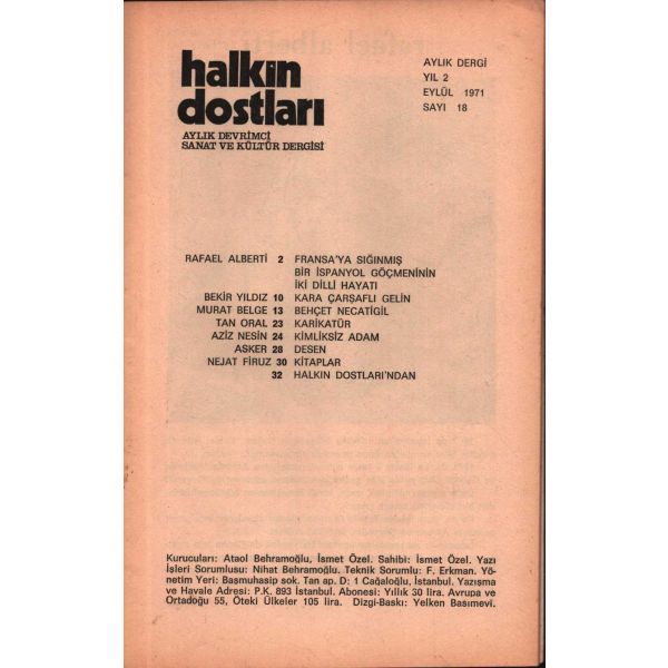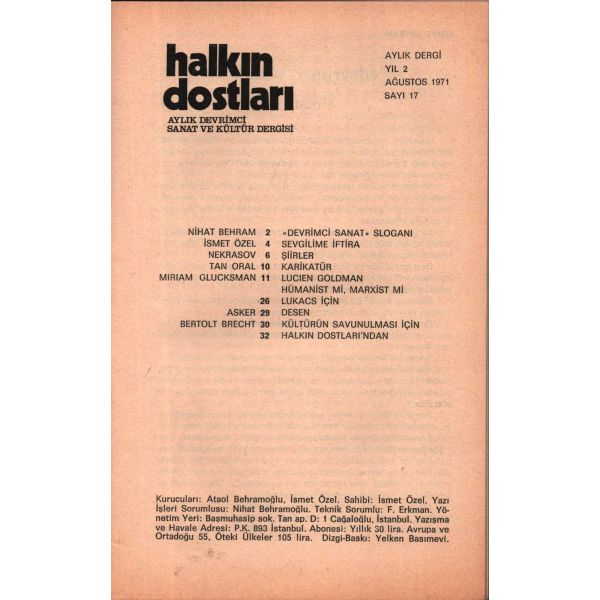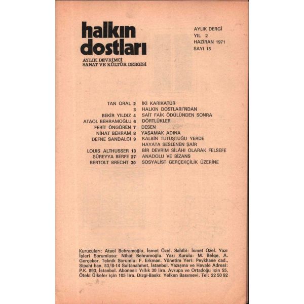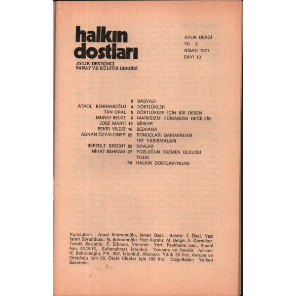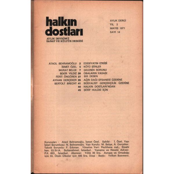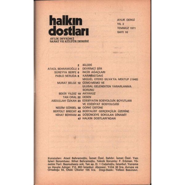 Aziz Nesin, Murat Belge, Nihat Behram, Tan Oral, Süreyya Berfe, Adnan Özyalçıner gibi ülkemizin önemli kalemlerinin eserlerinin yayınlandığı, aynı zamanda Louis Althusser, Bertolt Brecht, José Martí ve Pablo Neruda’nın yazı ve şiirlerine yer veren, edebiyat tarihimizin bu yeri doldurulamamış dergisinin ilk iki sayısı İstanbul'da, sonraki on sayısı Ankara'da, son altı sayısı ise tekrar İstanbul'da basılmıştır.