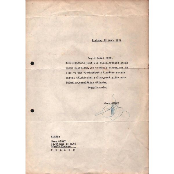 "Krakow, 12 Ocak 1978 - Sayın Kemal ÖZER, Gönderdiğiniz yeni yıl dileklerinizi ancak bugün alabildim. Çok teşekkür ederim. Ben de size ve tüm ´Cumhuriyet Ailesi´ne sonsuz başarı dileklerimi yollar, yeni yılda mutluluklar, esenlikler dilerim. Saygılarımla. Oben Güney..."