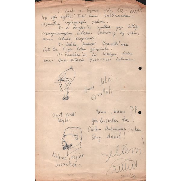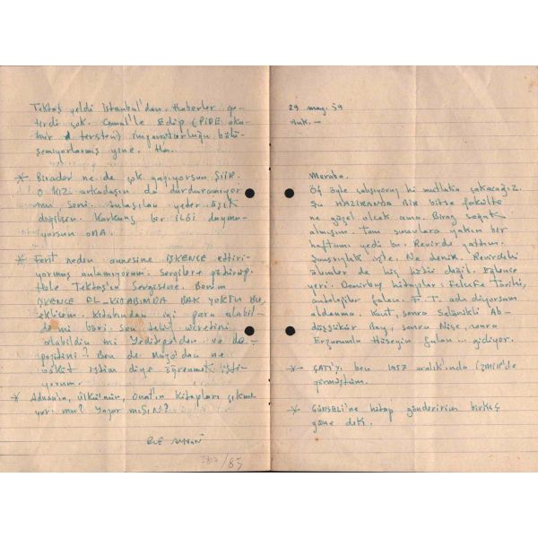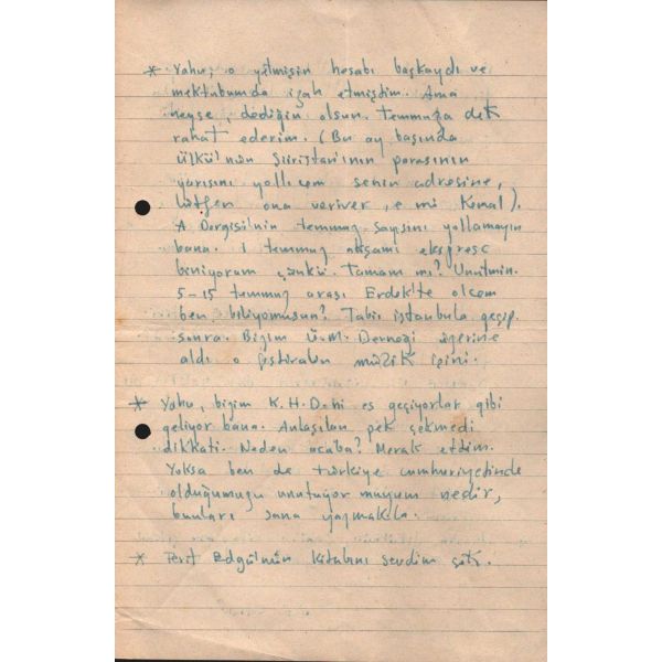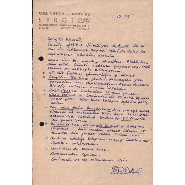1.10.1965 -- Sevgili Kemal, İşlerin gittikçe düzeliyor öyleyse. Bu bizim de utkumuz sayılır. İşlerinin daha da açılmasını yürekten dilerim. Sana dün bir mektup atmıştım. Mektubun dün geldi. Dünkü mektubu geçersiz say. İsteklerimi bu mektupla bildiriyorum..."