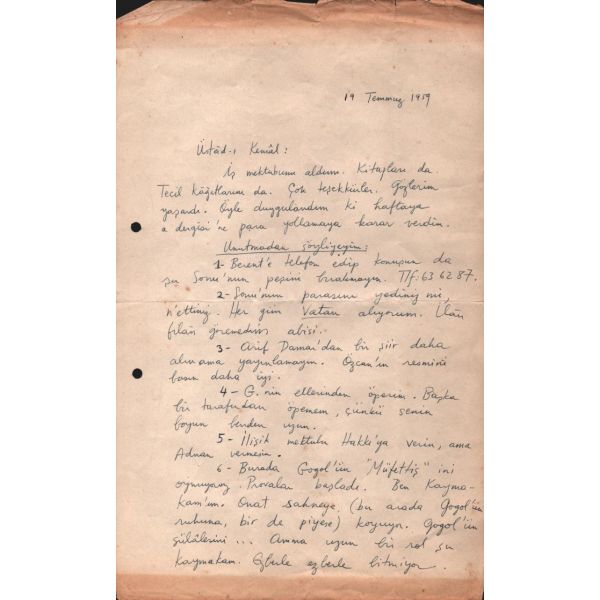 Kısa bir girizgâhtan sonra "Unutmadan söyliyeyim" başlığıyla 9 madde sıralayan Ülkü Tamer, 6. ve 7. maddelerde Gogol´ün "Müfettiş" oyununu oynadıklarından bahsetmekte: "6- Burada Gogol´ün ´Müfettiş´ini oynuyoruz. Provalar başladı. Ben Kaymakam´ım. Onat sahneye (bu arada Gogol´ün ruhuna, bir de piyese) koyuyor. Gogol´ün sülâlesini... Amma uzun bir rol şu Kaymakam. Ezberle ezberle bitmiyor. 7- Piyeste en hoşuma giden lâf: ´Şşşştt... Ayı oğlu ayılar!´ Tabii bunu çaktırmadan seyircilere söyliyeceğim şahsen". Arka sayfada ise mektup sahibinin elinden kendisinin ve Onat (Kutlar?)´ın birer karikatürü yer almakta.