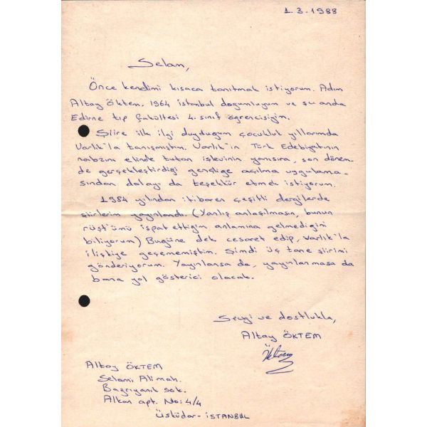 Mektup, "Şiire ilk ilgi duyduğum çocukluk yıllarımda Varlık´la tanışmıştım. Varlık´ın Türk Edebiyatının nabzını elinde tutan işlevinin yanısıra, son dönemde gerçekleştirdiği gençliğe açılma uygulamasından dolayı da teşekkür etmek istiyorum. 1984 yılından itibaren çeşitli dergilerde şiirlerim yayınlandı. (Yanlış anlaşılmasın, bunun rüşt´ümü ispat ettiğim anlamına gelmediğini biliyorum) Bugüne dek cesaret edip, Varlık´la ilişkiye geçememiştim. Şimdi üç tane şiirimi gönderiyorum. Yayınlansa da, yayınlanmasa da bana yol gösterici olacak." ifadelerini içermektedir.