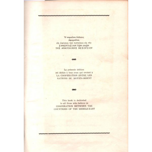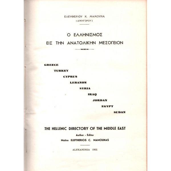 Yunanistan ve Türkiye hakkındaki satırların ağırlık kazandığı kitabın künyesinde, mercek altına alınan ülkeler sırasıyla yer almaktadır: "Greece (Yunanistan) - Turkey (Türkiye) - Cyprus (Kıbrıs) - Lebanon (Lübnan) - Syria (Suriye) - Iraq (Irak) - Jordan (Ürdün) - Egypt (Mısır) - Sudan". Bolca görsel ihtiva eden kitap içerisinde bahsi geçen ülkelerin meşhur ticarethanelerinin reklamları yer almaktadır. Editör Mamounas´ın 9 Mart 1953 tarihinde İzmir´de kaleme aldığı Fransızca ithaf okunamamıştır.