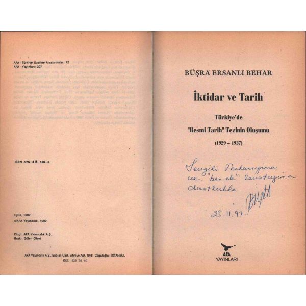 İthaf, "Sevgili Ferhancığıma ve ´ben de´ Cevatcığıma dostlukla. Büşra. 25.11.92" şeklindedir.