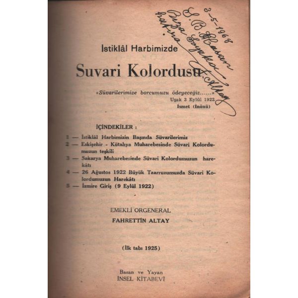 İthaf, "3-5-1968 S. B. Hasan Rıza Soyaka hatıra. F. Altay" şeklindedir. Harita ekleri eksiksiz.