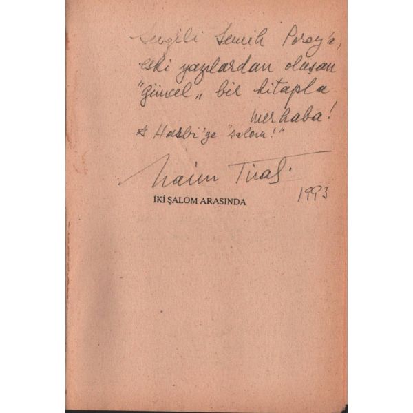 İthaf, "Sevgili Semih Poroy´a, eski yazılardan oluşan ´güncel´ bir kitapla merhaba! *Harbi´ye? ´Şalom!´ Naim Tirali 1993" şeklindedir.