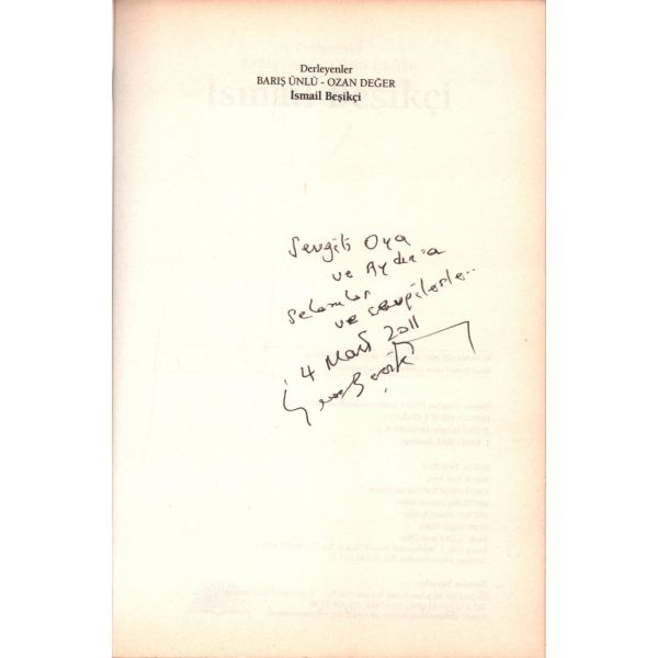 İthaf, "Sevgili Oya ve Aydın´a selamlar ve sevgilerle... 4 Mart 2011 İsmail Beşikçi" şeklindedir.