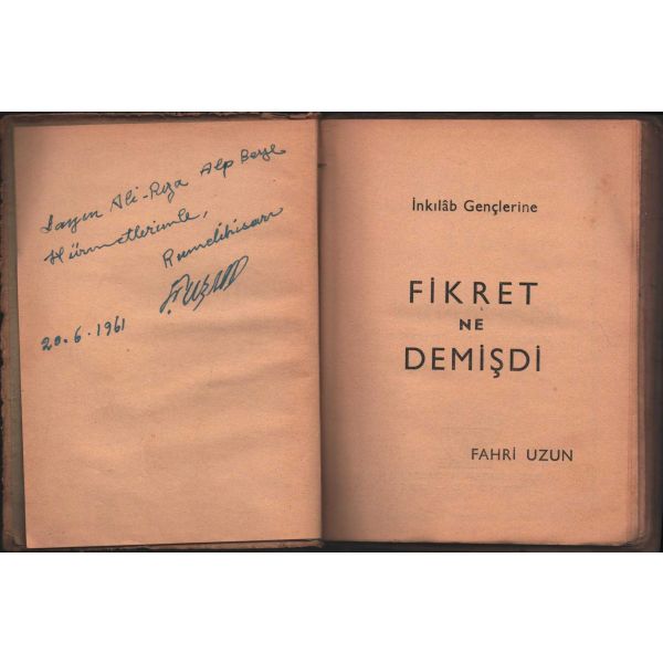İthaf, "Sayın Ali Rıza Alp Beye Hürmetlerimle. Rumelihisarı Fahri Uzun 20.6.1961" şeklindedir.