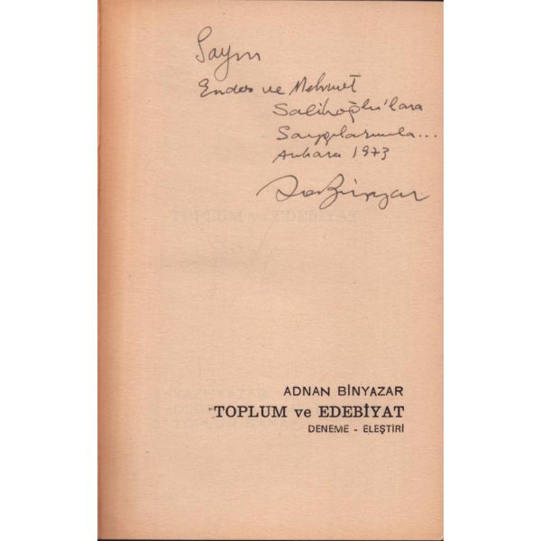İthaf, "Sayın Ender ve Mehmet Salihoğlu´lara saygılarımla. Ankara 1973 Adnan Binyazar" şeklindedir.