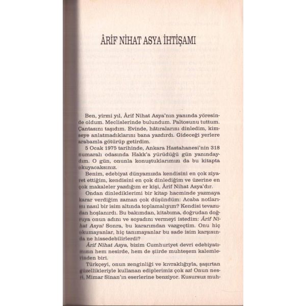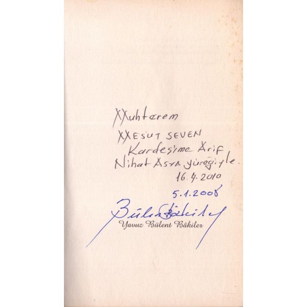 İthaf, "Muhterem Mesut Seven Kardeşime Arif Nihat Asya yüreğiyle. 16.4.2010 - 5.1.2008 Bülent Bâkiler" şeklindedir.