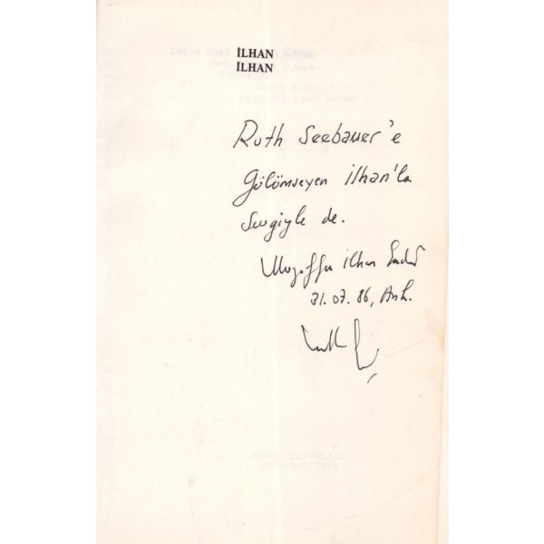 İthaf, "Ruth Seebauer´e gülümseyen İlhan´la - Sevgiyle de. Muzaffer İlhan Erdost 31.01. 86, Ank." şeklindedir.