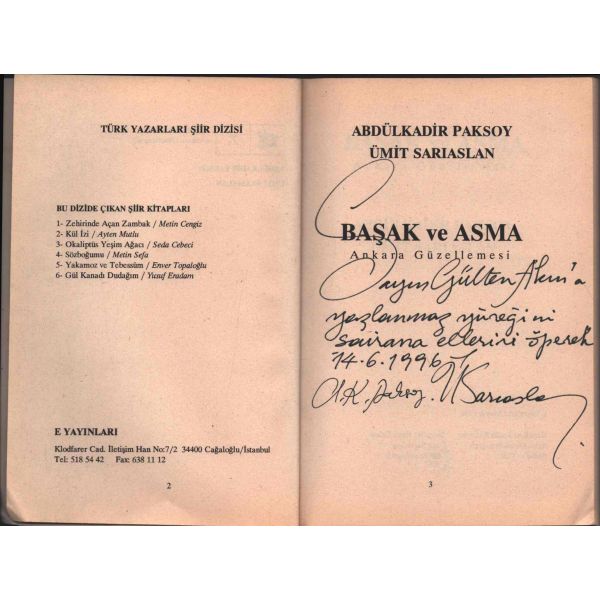 İthaf, "Sayın Gülten Akın´a yaşlanmaz yüreğini ? ellerini öperek. 14.6.1996 A. Paksoy - Ü. Sarıaslan" şeklindedir.