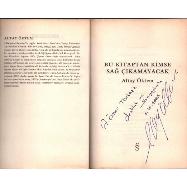 İthaf, "A. Ömer Türkeş´e dostluk ve saygılarla. 6.10.2005 Altay Öktem" şeklindedir.