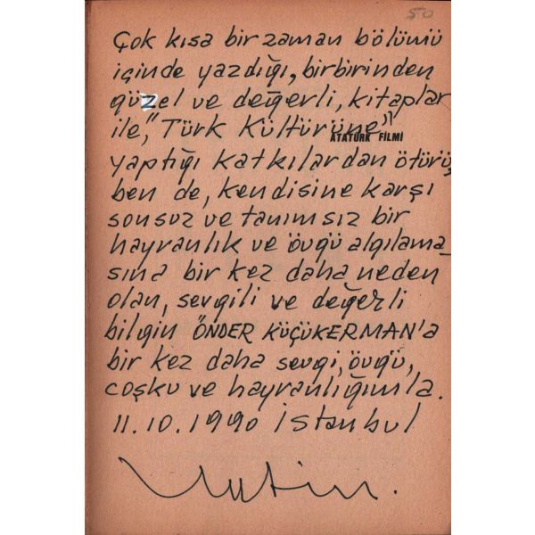 İthaf, "Çok kısa bir zaman bölümü içinde yazdığı, birbirinden güzel ve değerli kitaplar ile ´Türk Kültürüne´ yaptığı katkılardan ötürü ben de, kendisine karşı sonsuz ve tanımsız bir hayranlık ve övgü algılamasına bir kez daha neden olan, sevgili ve değerli bilgin ÖNDER KÜÇÜKERMAN´a bir kez daha sevgi, övgü, coşku ve hayranlığımla. 11.10.1990 İstanbul. Metin." şeklindedir.