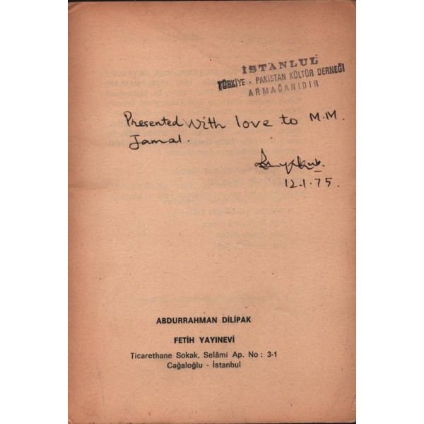 Aslen hintli olan Türk araştırmacı Mohammad Sadıq'tan Bakü doğumlu Hindoloji bölüm başkanı Abidin İtil Beye imzalı ve ithaflıdır. İthaf, "Mürşidim Sayın Prof. Abidin İtil´e derin saygılarımla. Mohammad Sadıq. Ankara - 3.VIII.1972" şeklindedir.