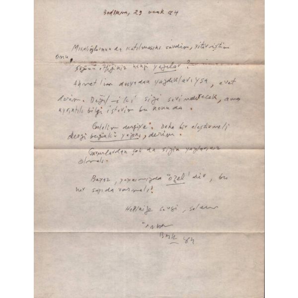 İlhan Berk´in, "Beyaz" dergisinin içeriği ve yazın dünyasındaki yeri hakkındaki eleştiri ve düşüncelerini kaleme aldığı mektup, "Gelelim sergiye: Daha bir eleştirmeli dergi bugünkü yazını, derim. Gavurlardan çok da sizin yazılarınız olmalı. Beyaz, yazınımızda özel´dir, bu her sayıda vurgulanmalı!" ifadelerini içermektedir.