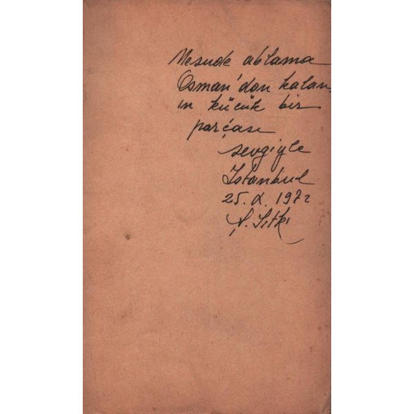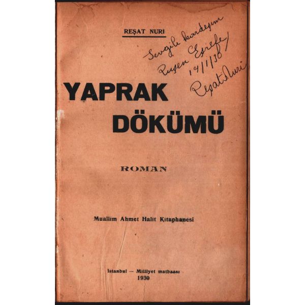 İthaf, "Sevgili kardeşim Ruşen Eşrefe. 19/I/30 Reşat Nuri" şeklindedir. Orijinal kapakları korunarak yapılmış, tümüyle deri, yeni cildi içinde…