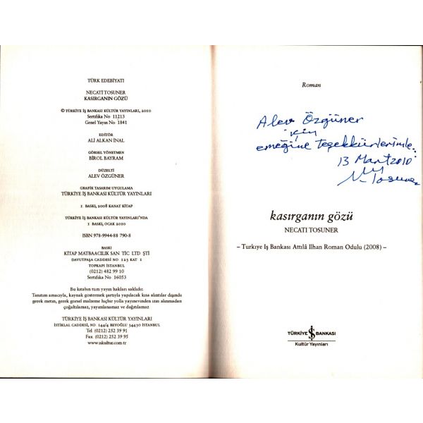 İthaf, "Alev Özgüner için emeğine teşekkürlerimle. 13 Mart 2010 N. Tosuner" şeklindedir.