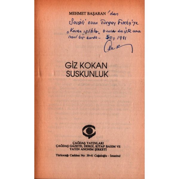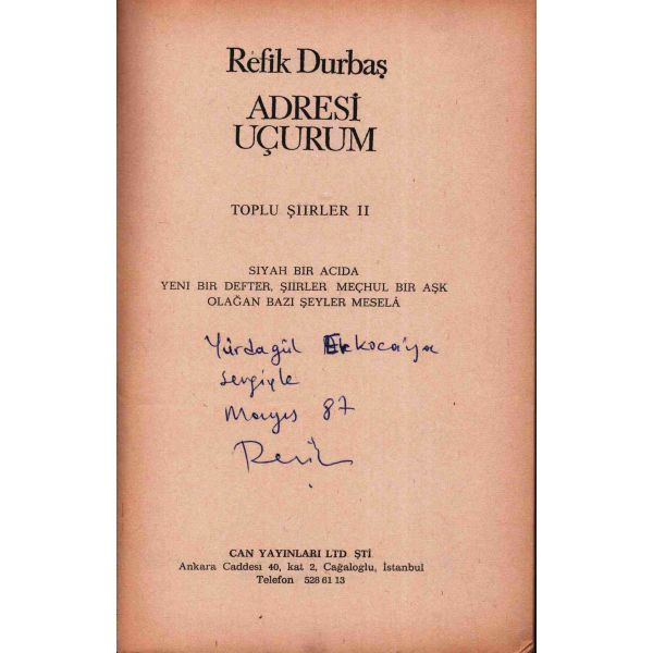 İthaf, "Yurdagül Erkoca´ya sevgiyle. Mayıs 87 Refik" şeklindedir.