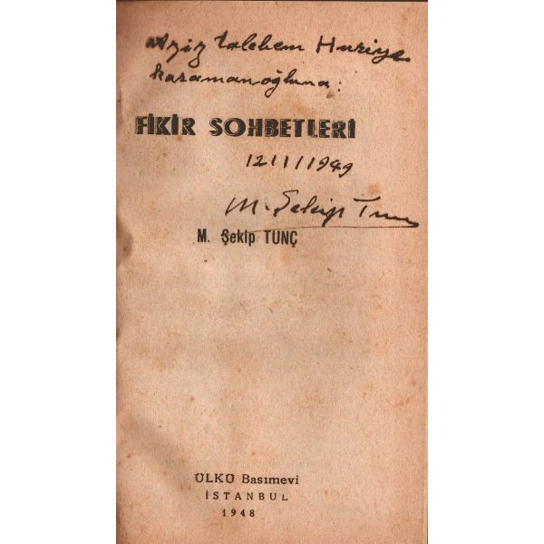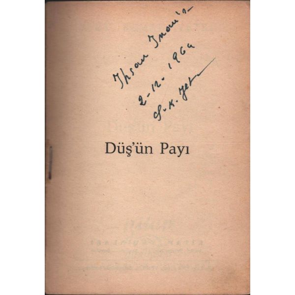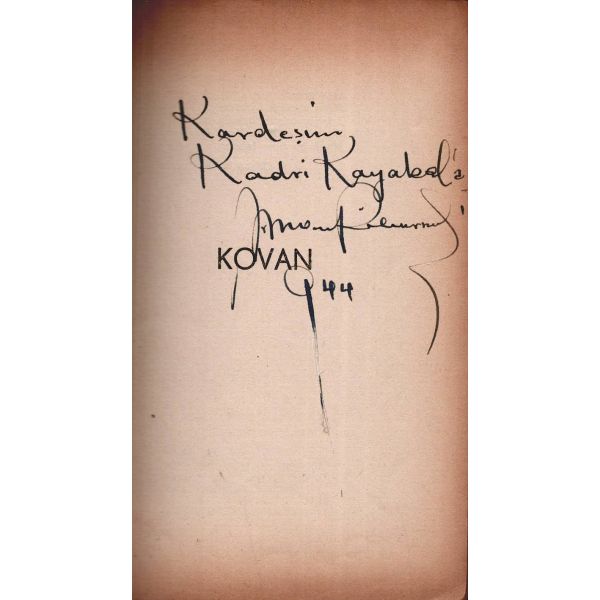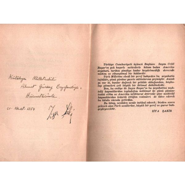 İthaf, " Kütahya Milletvekili Ahmet Günsoy Beyefendiye, hürmetlerimle. 21. Mart . 1954" şeklindedir.