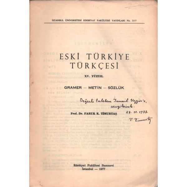 İthaf, " Değerli talebem İsmail Uzgür´e, sevgilerimle. 28.11.1977" şeklindedir.