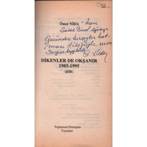 İthaf, " Ömer Nida´dan Salah Birsel Ağabeye gücünden bir şeyler katması dileğiyle. 23.4.1996 Sevgi ve saygılarla." şeklindedir.
