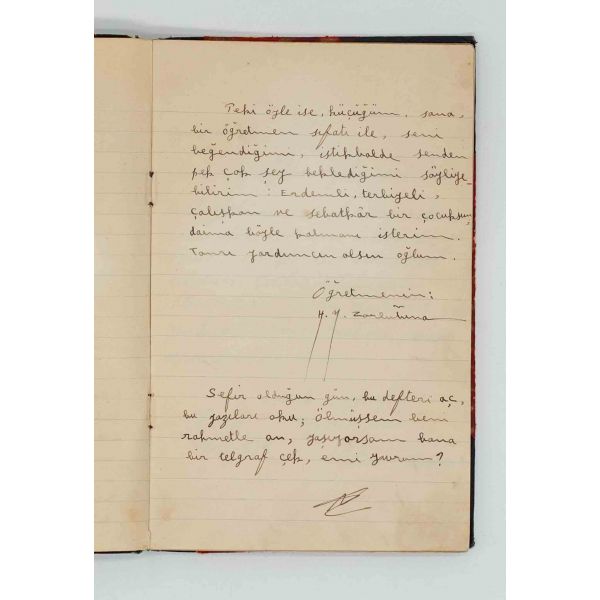 Yurdun dört bir yanında öğretmen olarak görev yapan şair ve yazar Halide Nusret Zorlutuna´nın, 12 Mayıs 1938 tarihinde Nejat isimli öğrencisinin hatıra defterine yazdığı veda yazısı: "Yavrum benim, Sana hatıra yazmak!... Bu, manasız, hattâ biraz da gülünç, değil mi? dedim. -Hayır teyze, diye cevap verdin, bundan sonra belki de hiç hocam olmıyacaksınız; bu defterde bana hocalık ettiğiniz günlerin hatırası bulunsun! Peki öyle ise, küçüğüm, sana, bir öğretmen sıfatı ile, seni beğendiğimi, istikbalde senden pek çok şey beklediğimi söyliyebilirim: Erdemli, terbiyeli, çalışkan ve sebatkâr bir çocuksun, daima böyle kalmanı isterim. Tanrı yardımcın olsun oğlum. Öğretmenin: H. N. Zorlutuna"