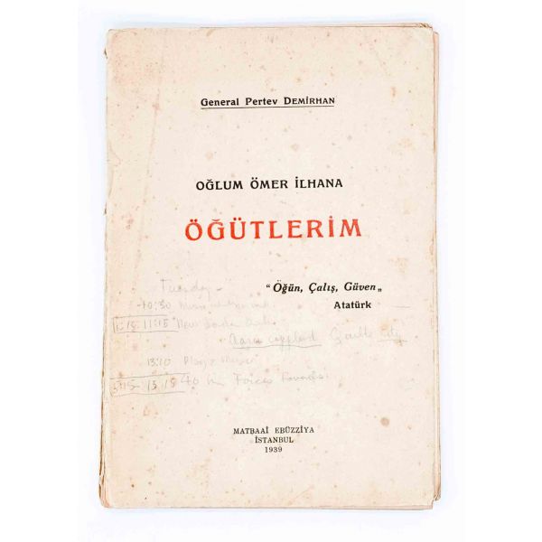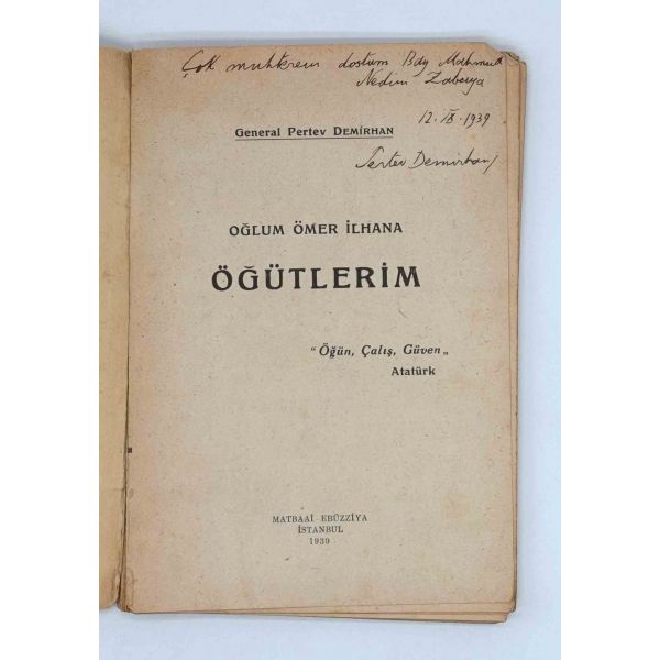 İthaf, "Çok muhterem dostum Bay Mahmud Nedim Zabcıya. 12.IX.1939, Pertev Demirhan" şeklindedir. "Önsöz: Oğlum, bütün hayatımda şerefimi, namusumu bozmadım. Fakirim; servet sahibi değilim. Sözler uçar, yazılar kalır. Onun için yazılı olarak bıraktığım bu Öğütler şeref ve namusumla beraber benden sana kalacak yegâne mirastır."